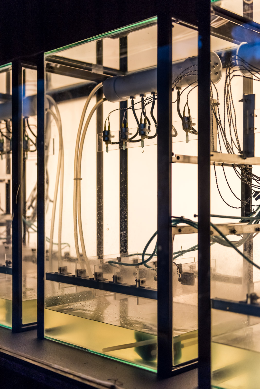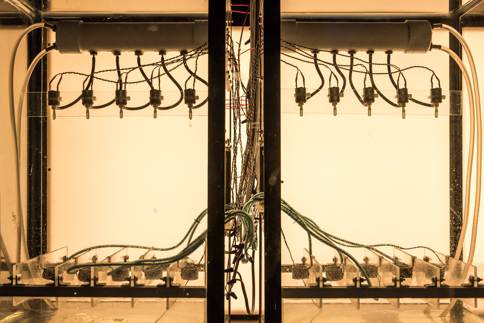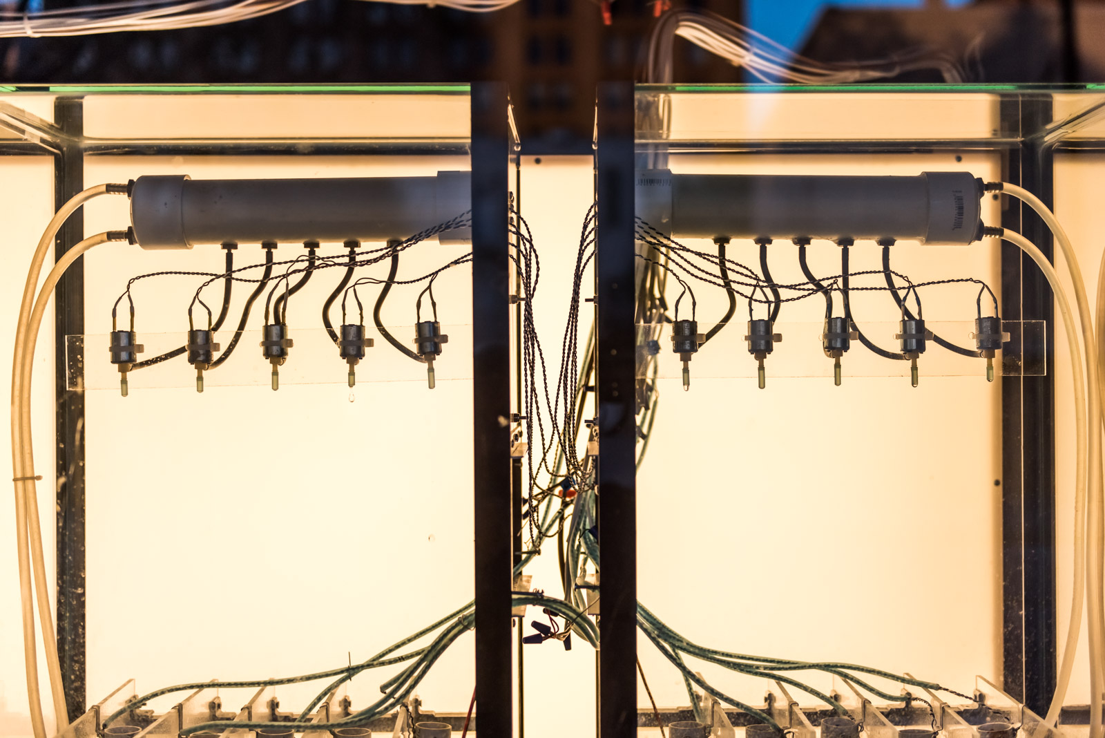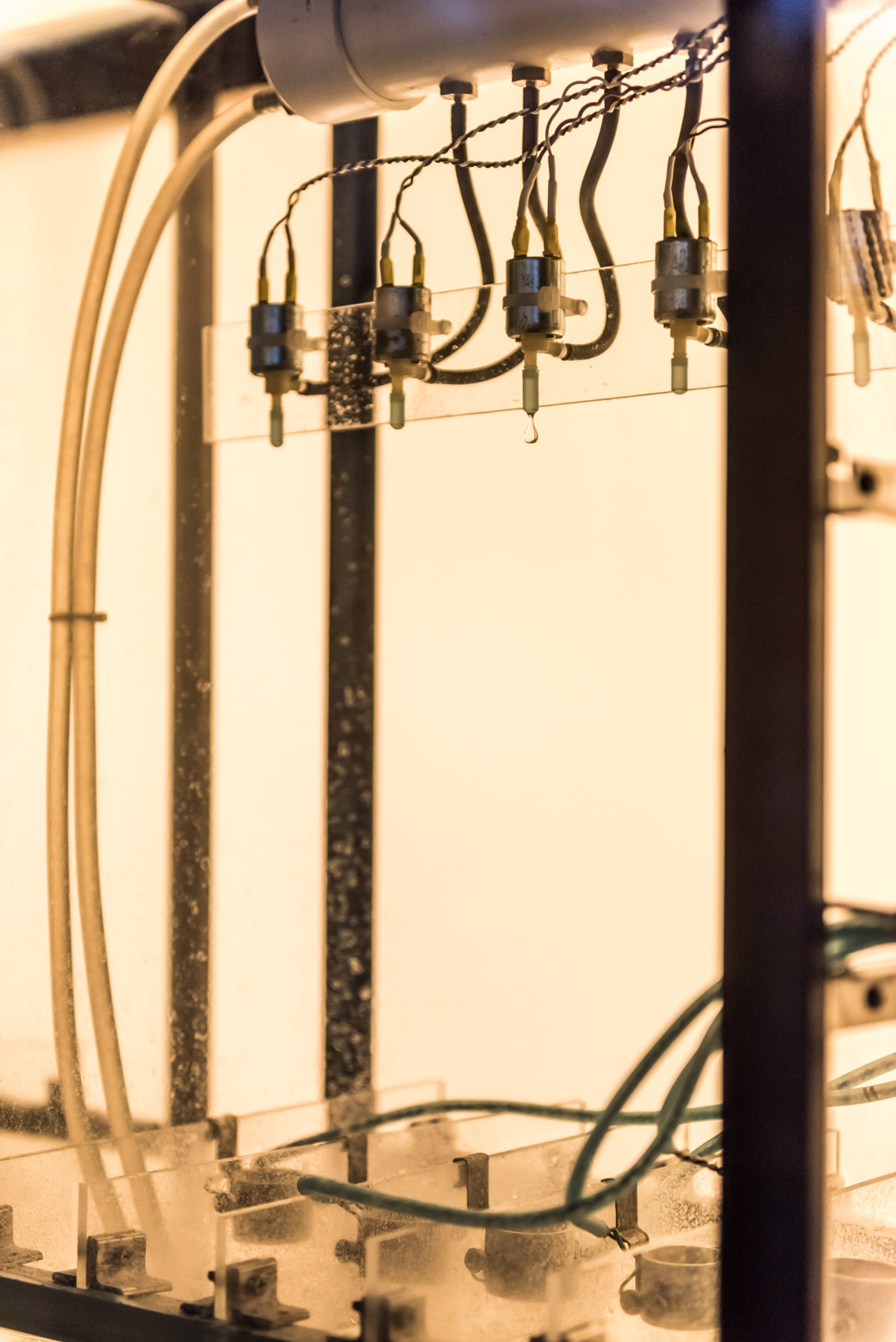 Drip Machine is an automated electro-hydraulic system that produces sound. It is composed of four repurposed aquariums, water pumps, electric valves, water sensors, plastic tubing, custom electronics and speakers.