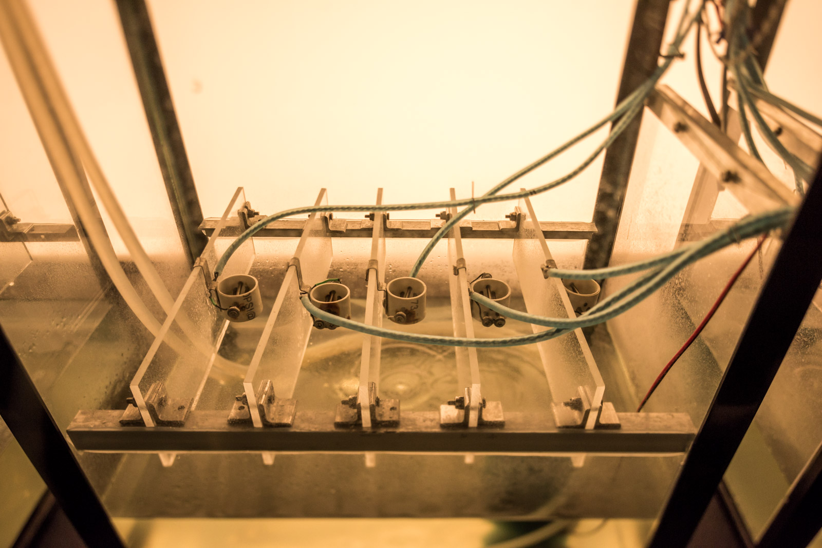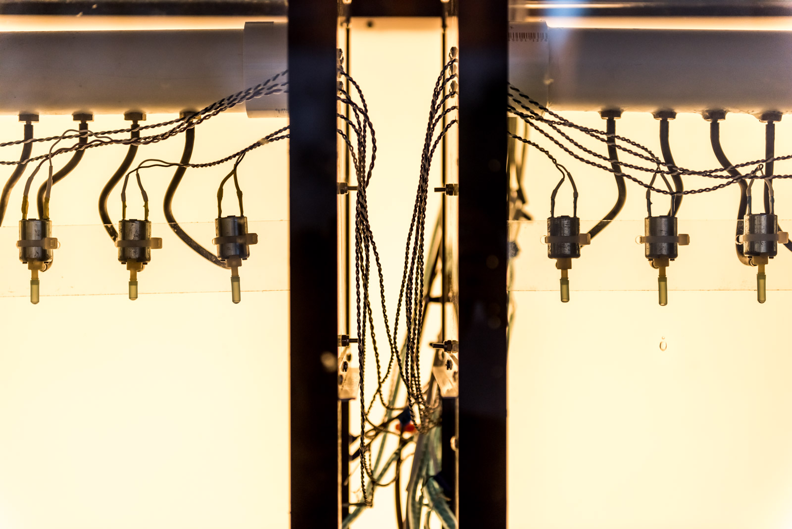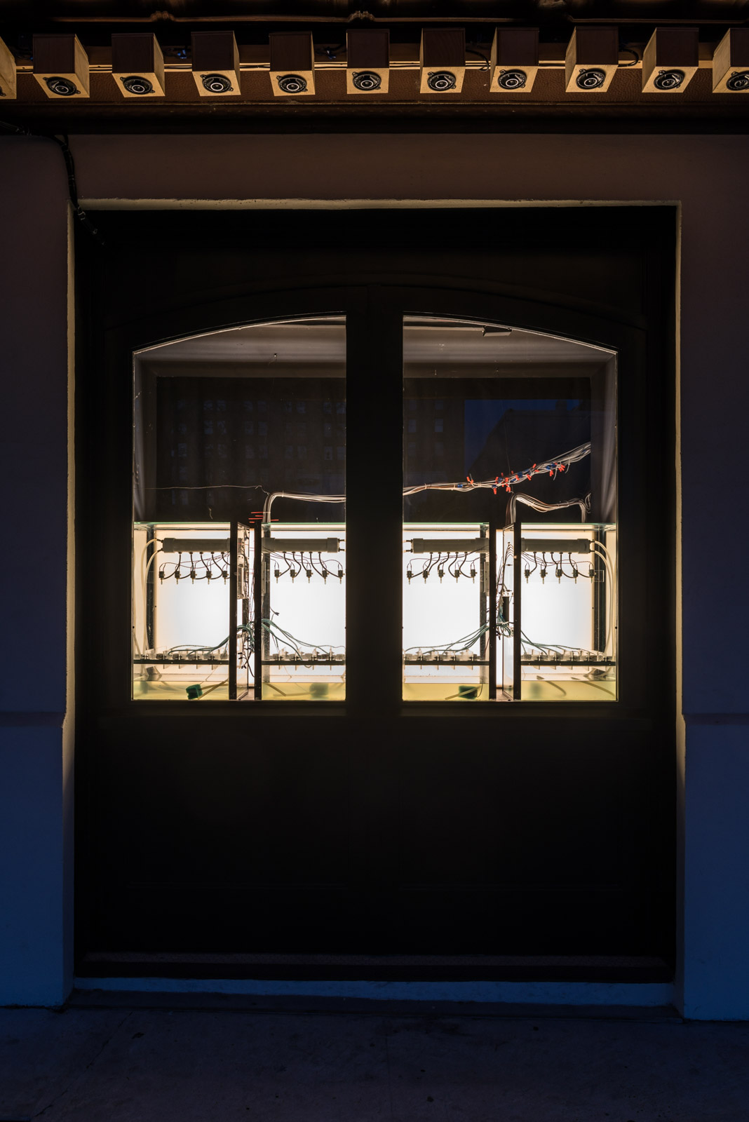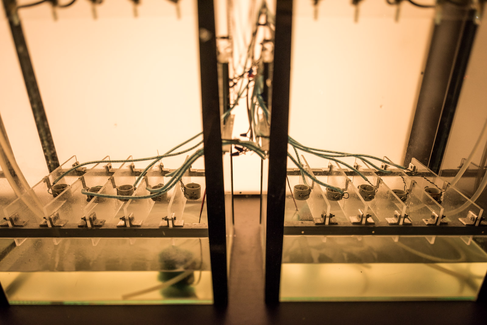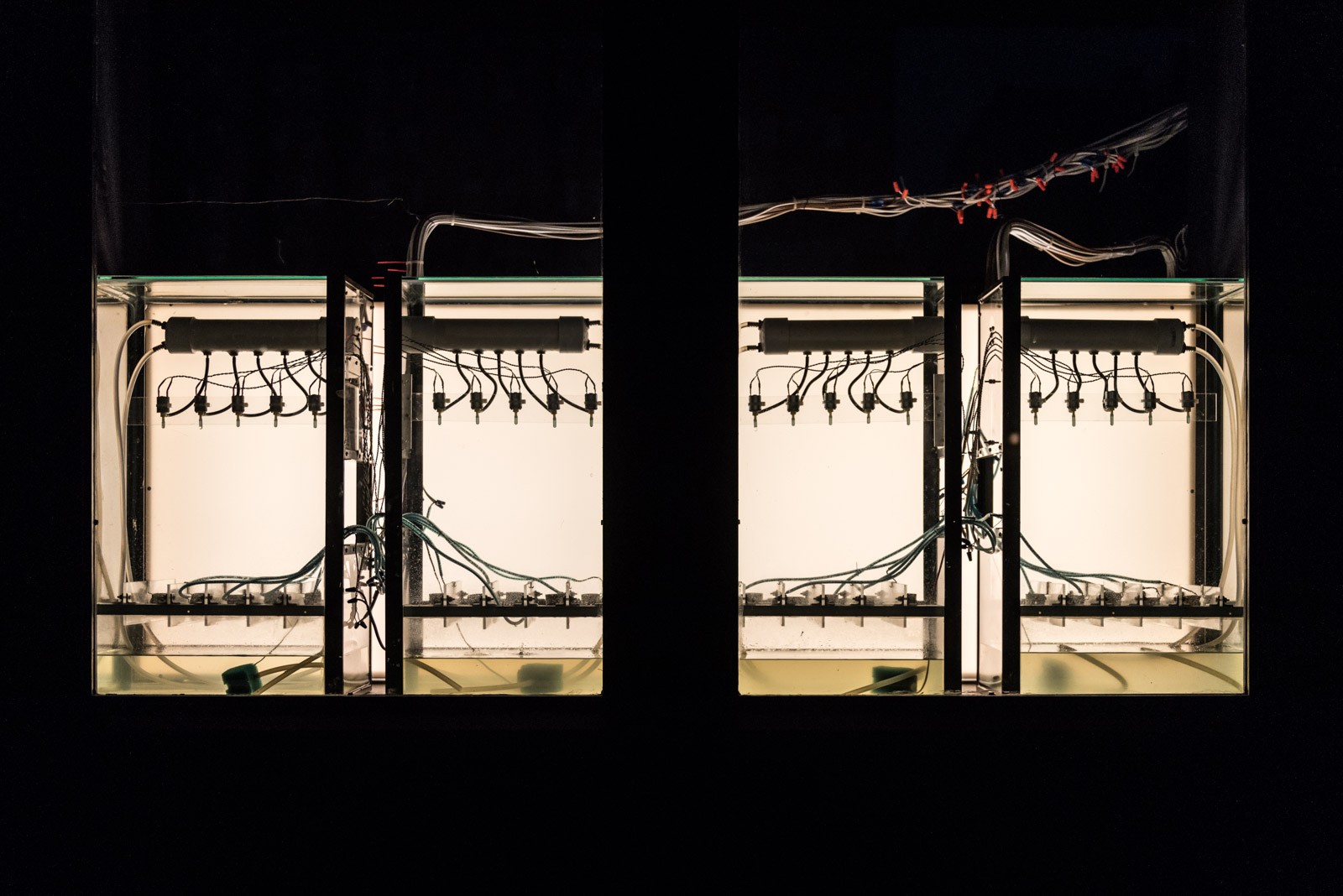 Drip Machine is an automated electro-hydraulic system that produces sound. It is composed of four repurposed aquariums, water pumps, electric valves, water sensors, plastic tubing, custom electronics and speakers.