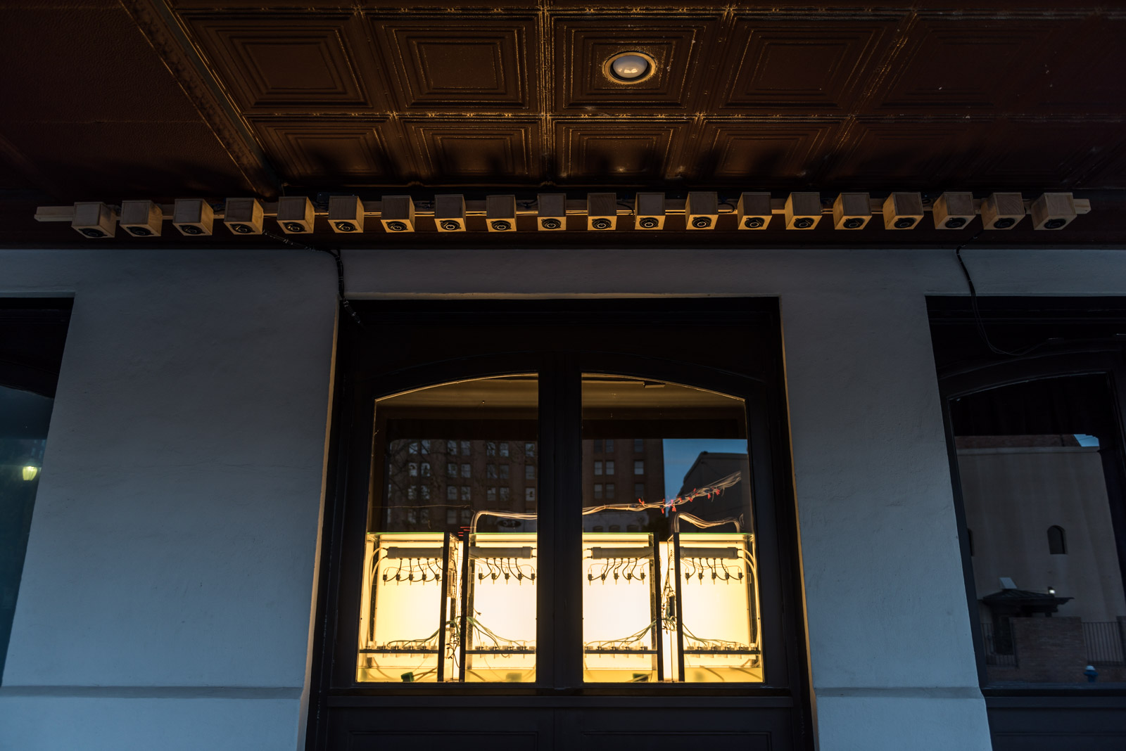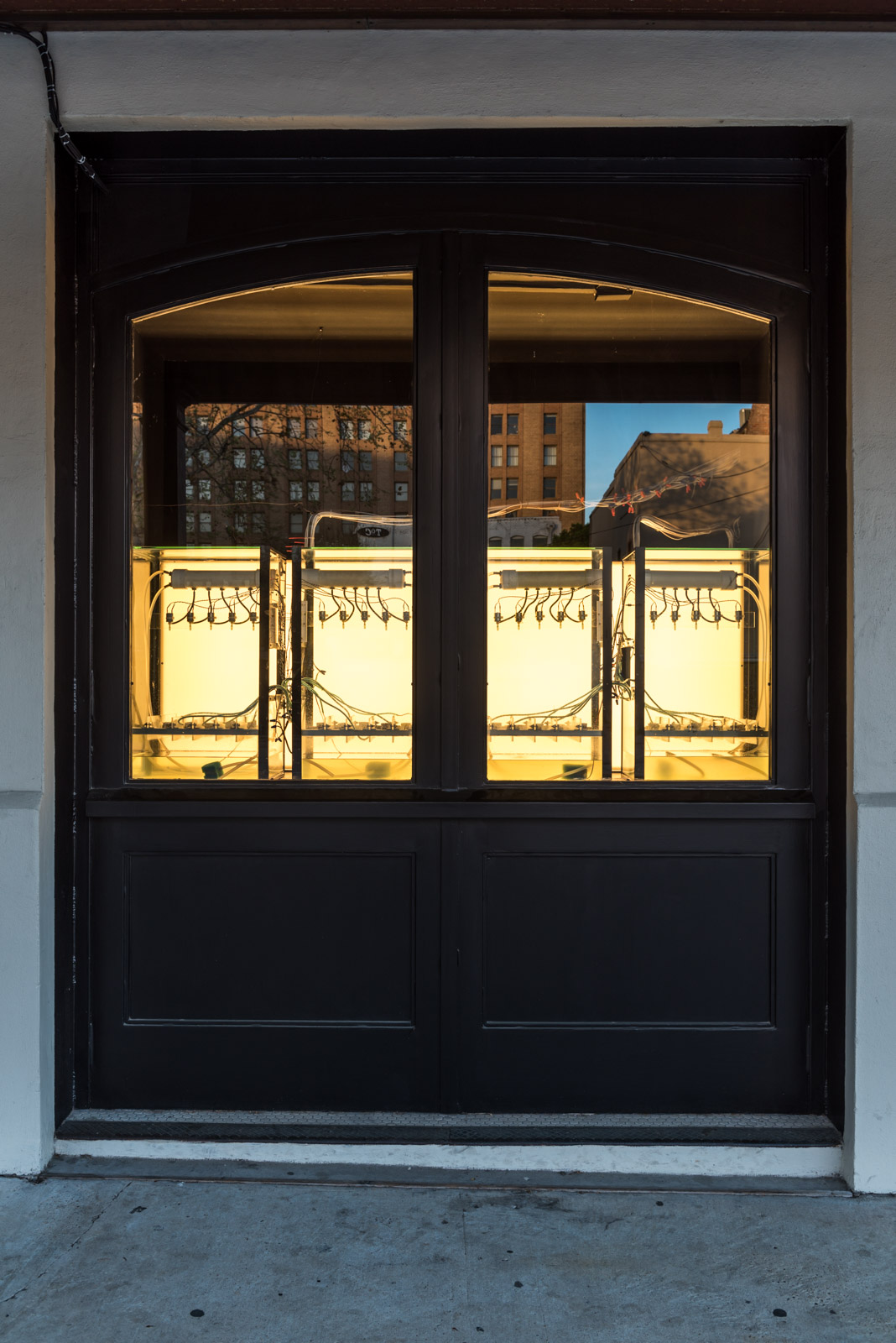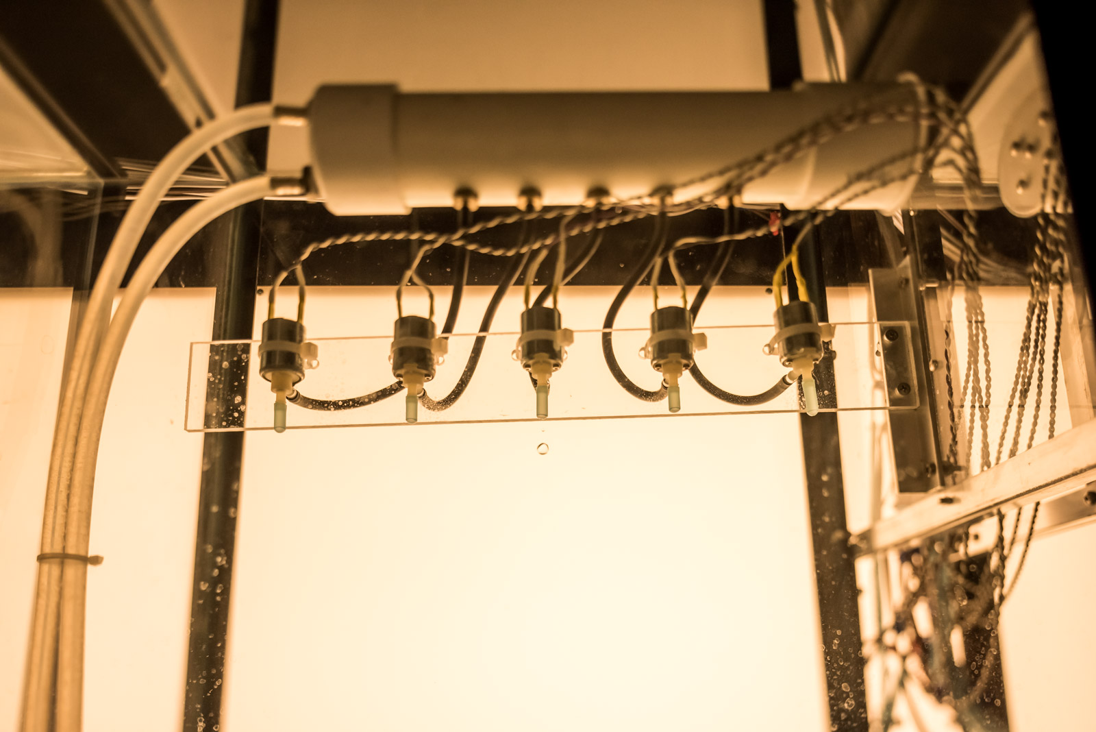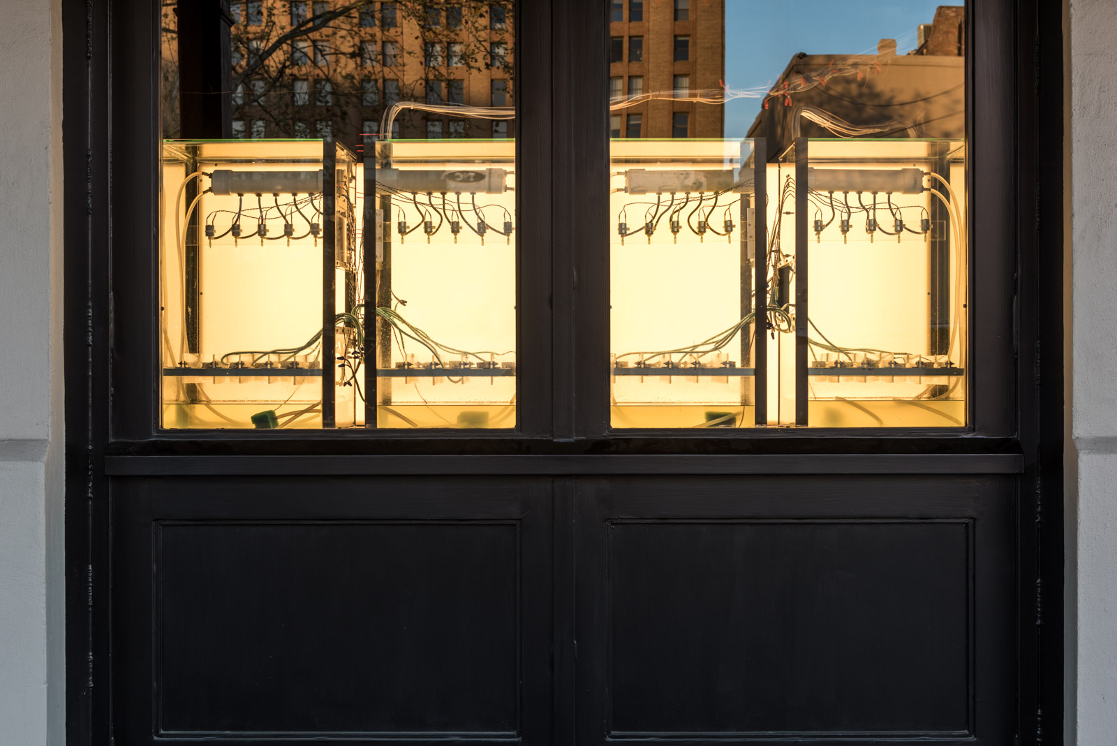 Drip Machine is an automated electro-hydraulic system that produces sound. It is composed of four repurposed aquariums, water pumps, electric valves, water sensors, plastic tubing, custom electronics and speakers.
